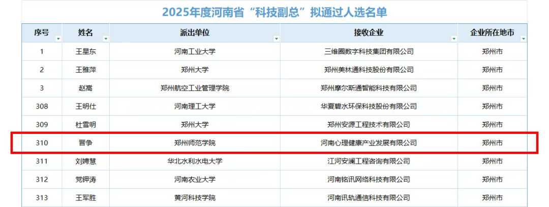 近日,河南省科学技术厅发布《河南省2025年“科技副总”拟通过名单公示》,郑州师范学院晋争博士经审核批准,正式获聘并委派至我公司担任“科技副总”。这既是对晋争博士在心理科技领域专业能力的充分肯定,也是对我公司在心理健康科技领域持续发展的重要支持。